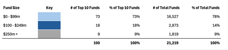 This pushes larger funds into larger investments which naturally are less numerous, tend to be higher-priced and have a lower probability of high exits, whereas smaller funds can be more selective, giving them a better chance at generating exceptional returns.
