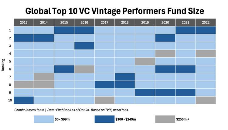 The above analysis by a VC investor using Pitchbook data demonstrates the strong performance of smaller funds based on Total Value to Paid In Capital (TVPI). Other analysis based on data from Pitchbook and analysis from Sante Ventures also showed that venture funds smaller than $350 million are 50% more likely to generate a 2.5x return than funds larger than $750 million.