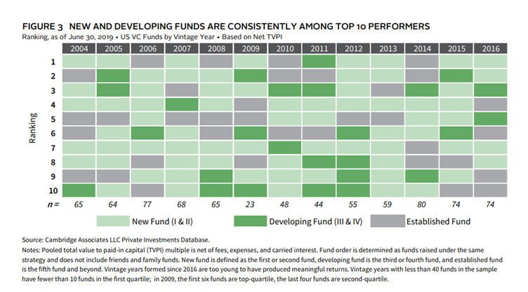 Similarly Cambridge Associates, highlighted in their report on how VC positively disrupts intergenerational investing, that between 2004 and 2016, top-performing US funds were predominantly first-time or relatively new funds.