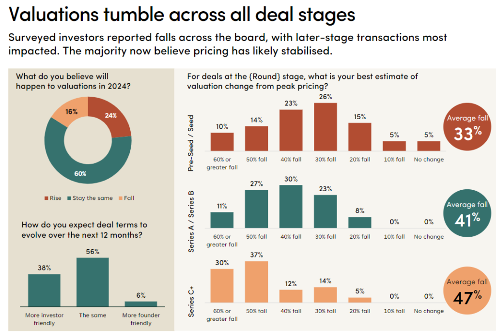 With regard to the Australian market, the report on startup fundraising by Cut Through Venture and Folklore Ventures shows a consistent trend across all stages of fundraising, pointing to a general drop down in investment valuation. One key takeaway from the report is the significant drop in Series A funding rounds, which have decreased by approximately 41%.